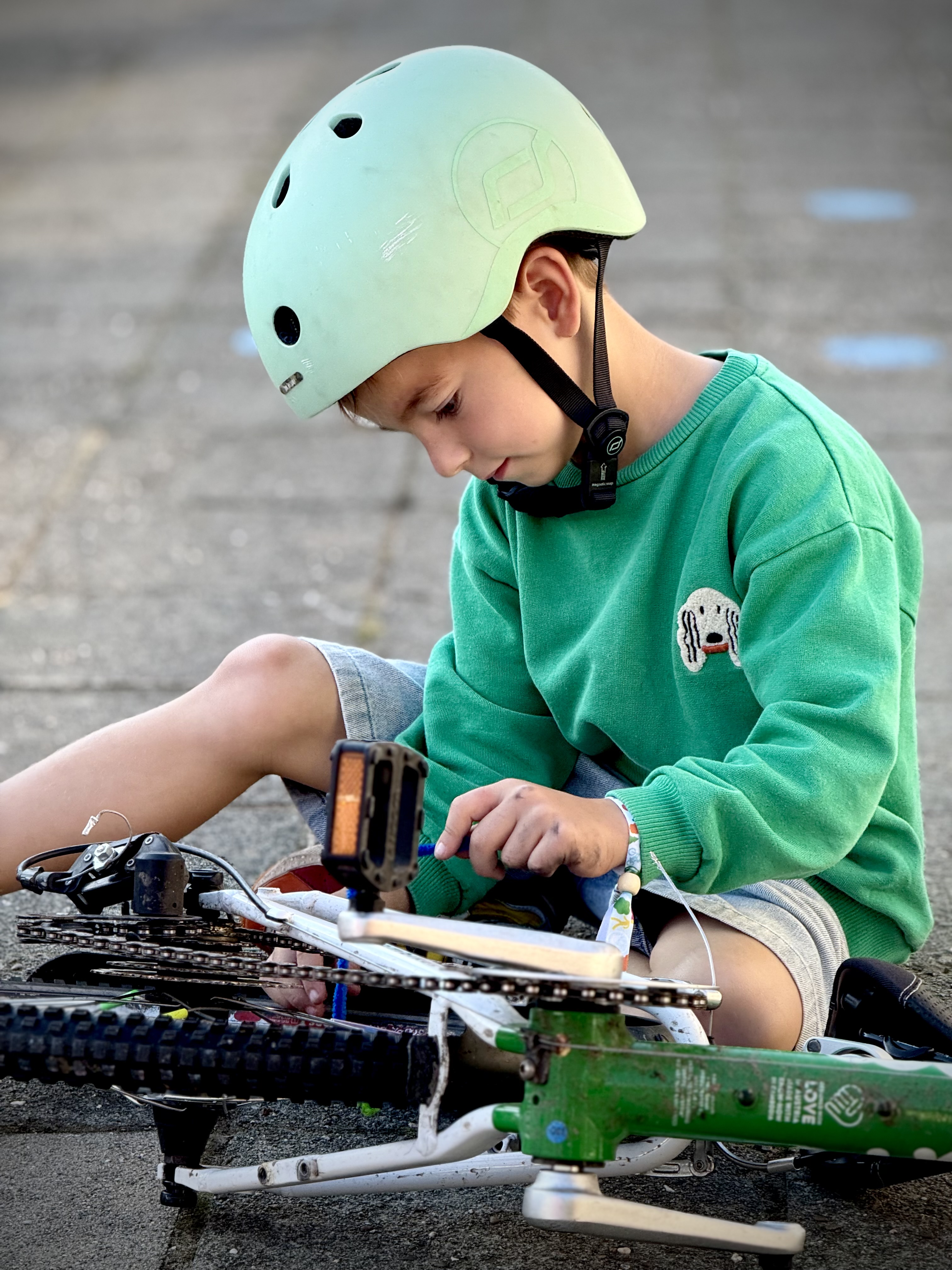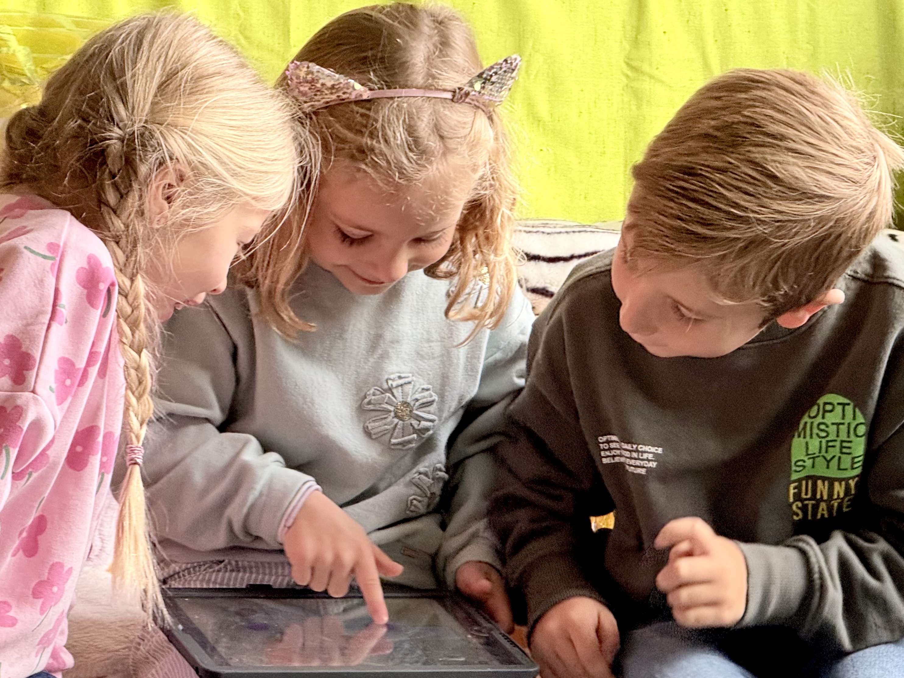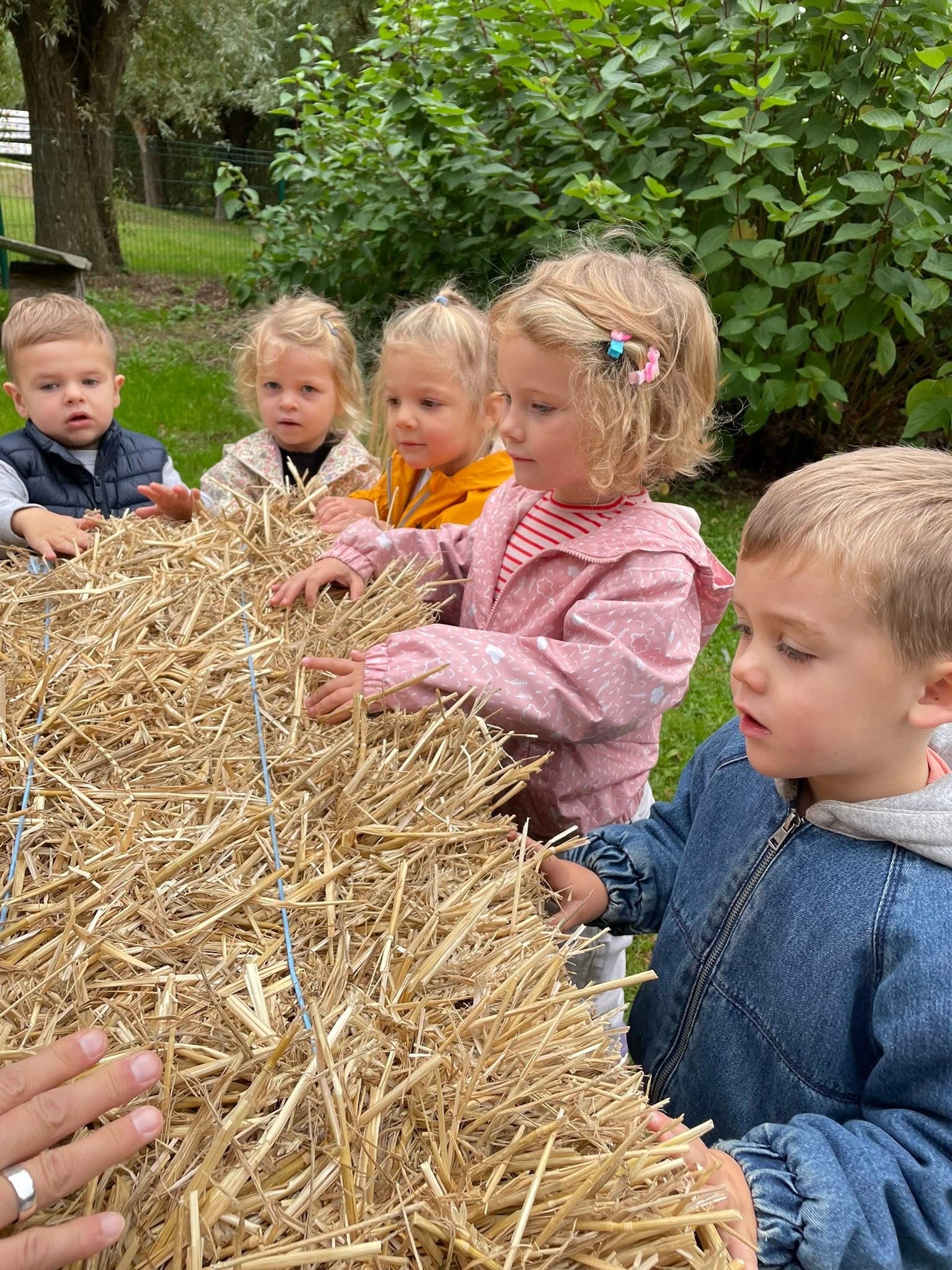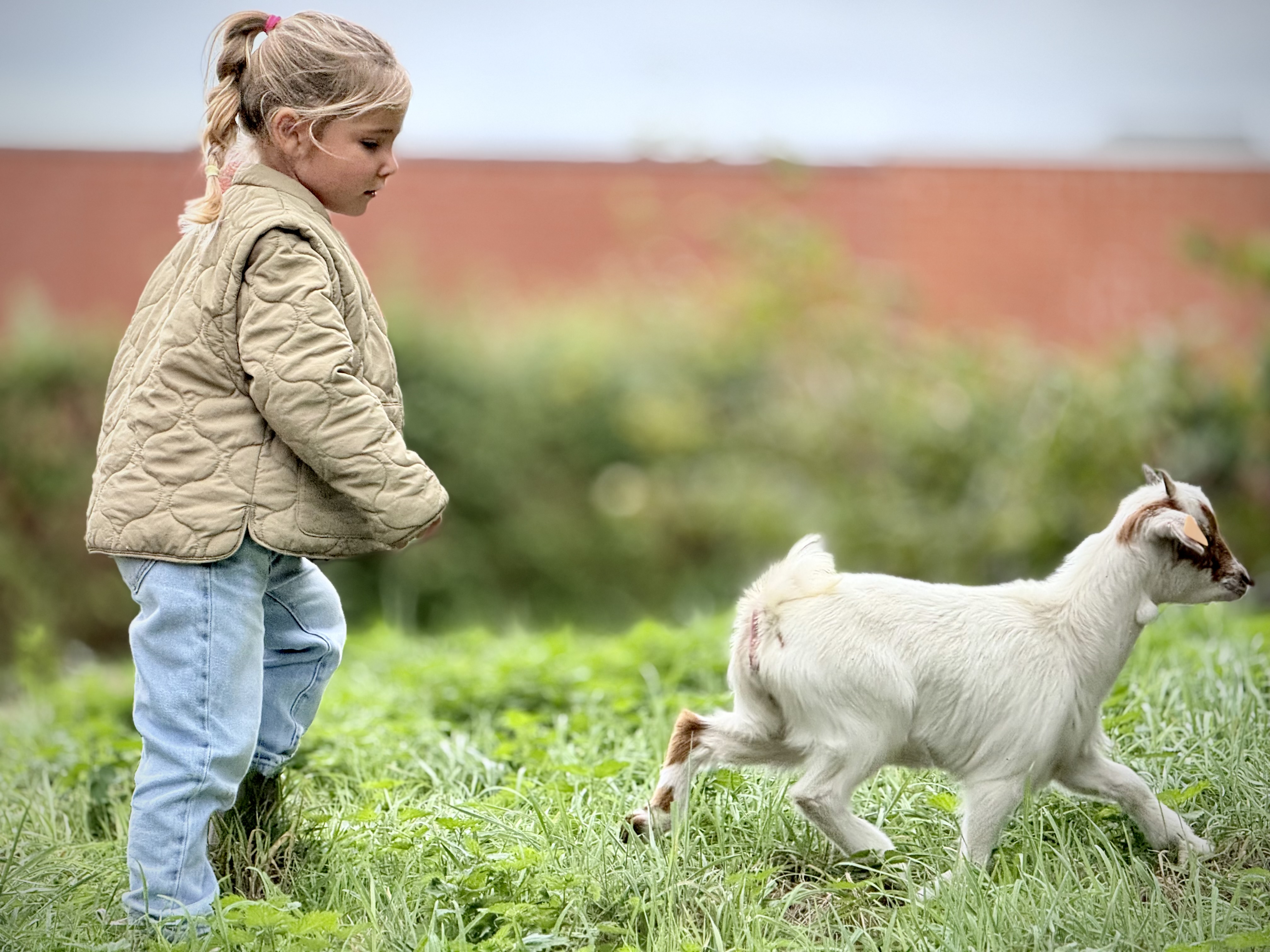Een grote tuin met fruitbomen, een vijver, een buitenklas, een kippenhok, een zandbak, 2 geitjes en heel veel plaats om in het gras te dollen en te stoeien.